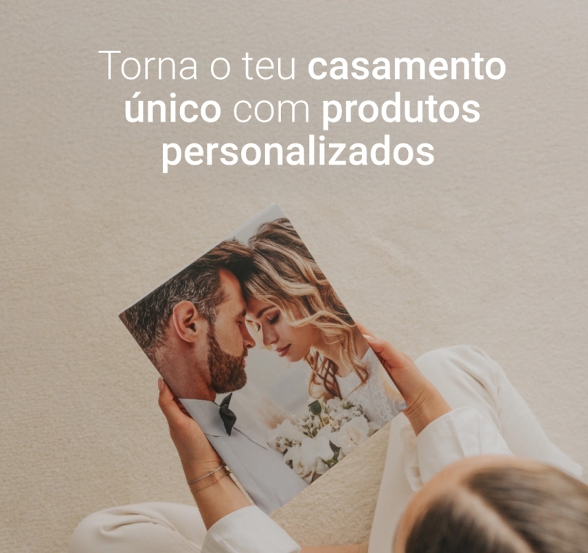 • Os álbuns para casamento também fazem parte e são ideais para guardar as melhores recordações e podem ser personalizados com diferentes tipos de capa, papel e acabamento. Se ainda não sabes como fazer um álbum de casamento, não te preocupes — o nosso editor online é simples e intuitivo. Assim que recebas as fotos da tua cerimónia, basta seleccionares o melhor de cada parte - dos preparativos, aos vossos convidados, passando claro pelo momentos do “Sim, Aceito”, até à grande festa, onde nunca se esquece a primeira dança ou corte do bolo.